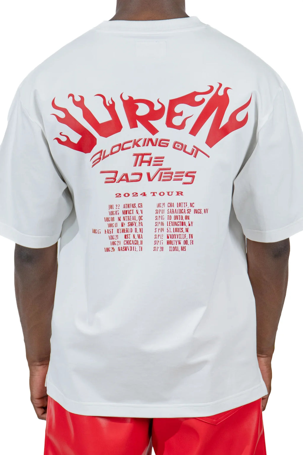 The Juren Blocking Out the Bad Vibes White Tee features a bold red print on a classic white canvas. The front showcases an eye-catching design with red vegan leather, intricately outlined with embroidery for added depth. The back highlights the Juren logo alongside a creative faux 2024 tour listing style print, infusing a playful and unique twist. Perfect for making a statement while keeping it cool and stylish.