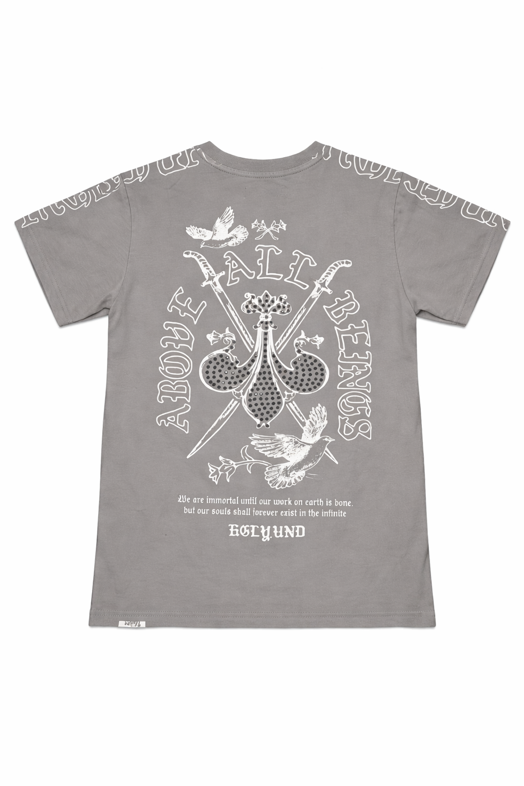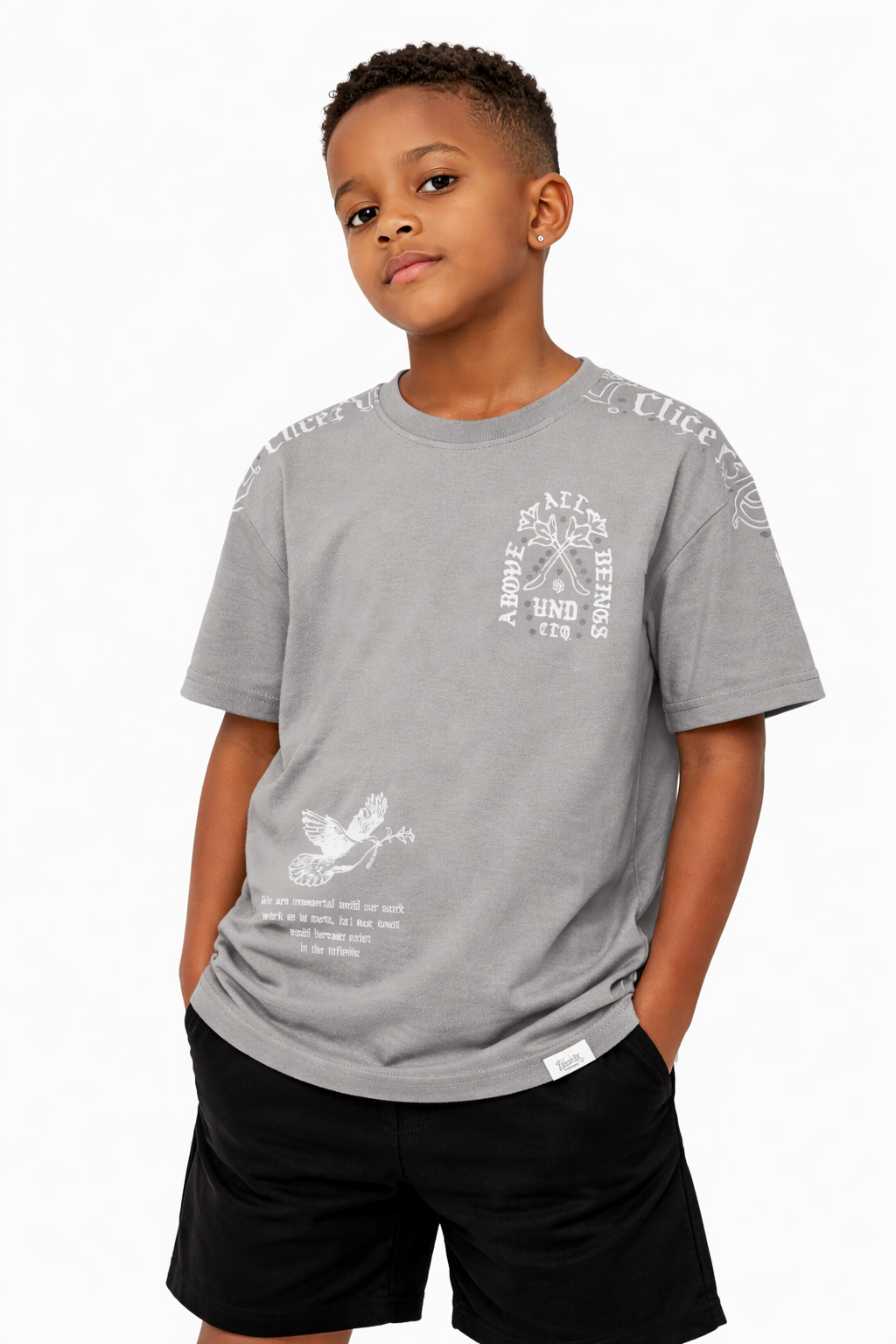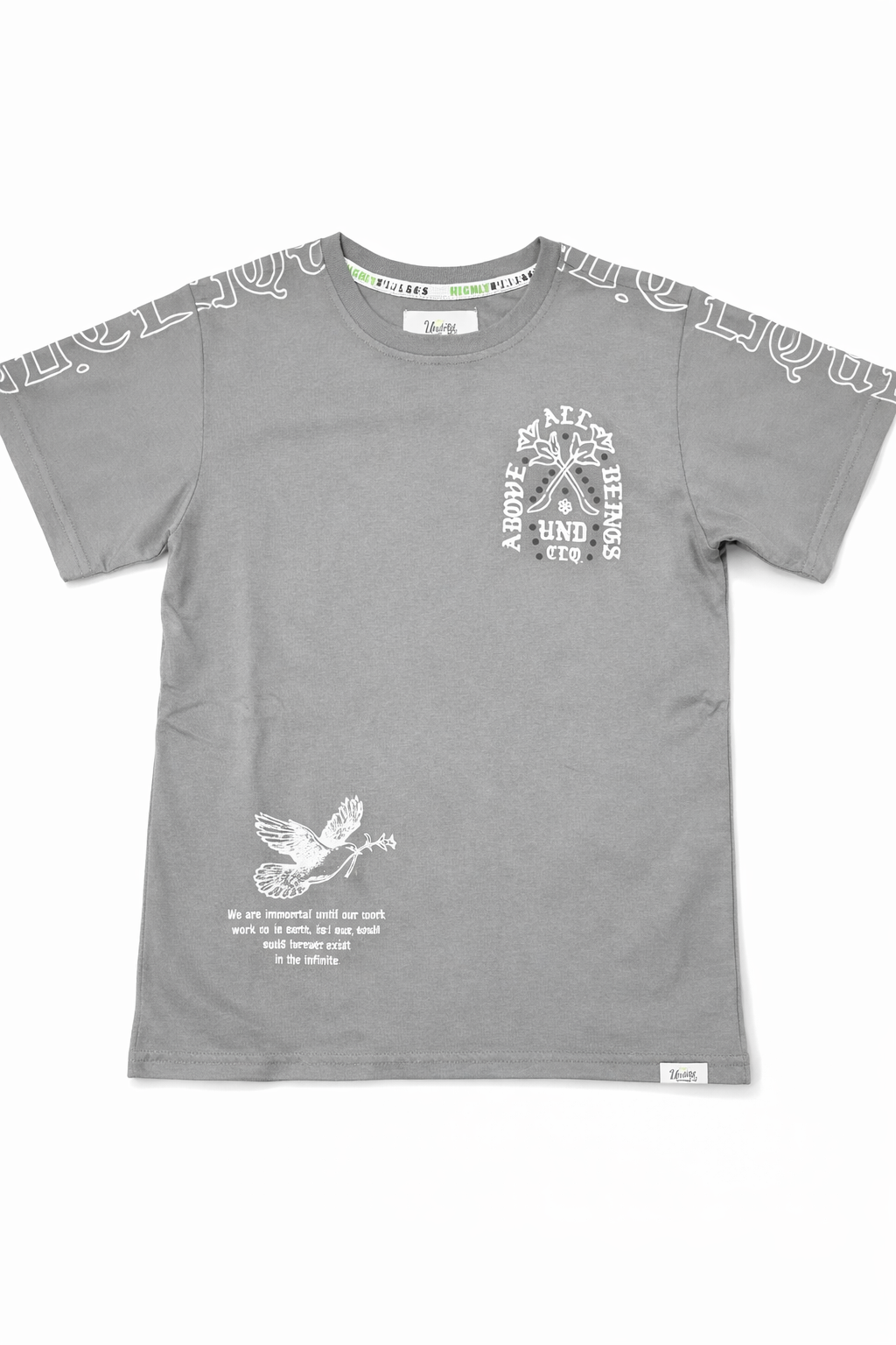 Highly Undrtd Kids Above All T-Shirt in Pewter — premium streetwear for kids with a classic normal fit. Style US6110K features a timeless pewter colorway perfect for everyday wear. Order your regular size for the ideal fit. Made with quality construction designed to last through active play and repeated wear. Follow care instructions on the garment tag to maintain color and fabric integrity.