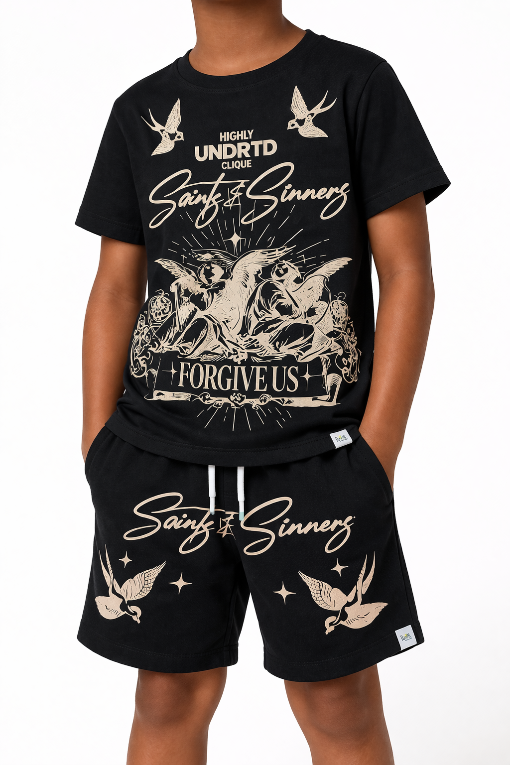 Highly Undrtd Kids Saints & Sinner T-Shirt in classic black delivers premium streetwear style for young trendsetters. Featuring the iconic Saints & Sinner graphic, this tee combines bold design with everyday comfort. Normal fit cuts true to size for an effortless look. Crafted for durability, follow care instructions on the garment tag to maintain quality. Style number US6104K. Perfect for kids who want to stand out with authentic streetwear edge.