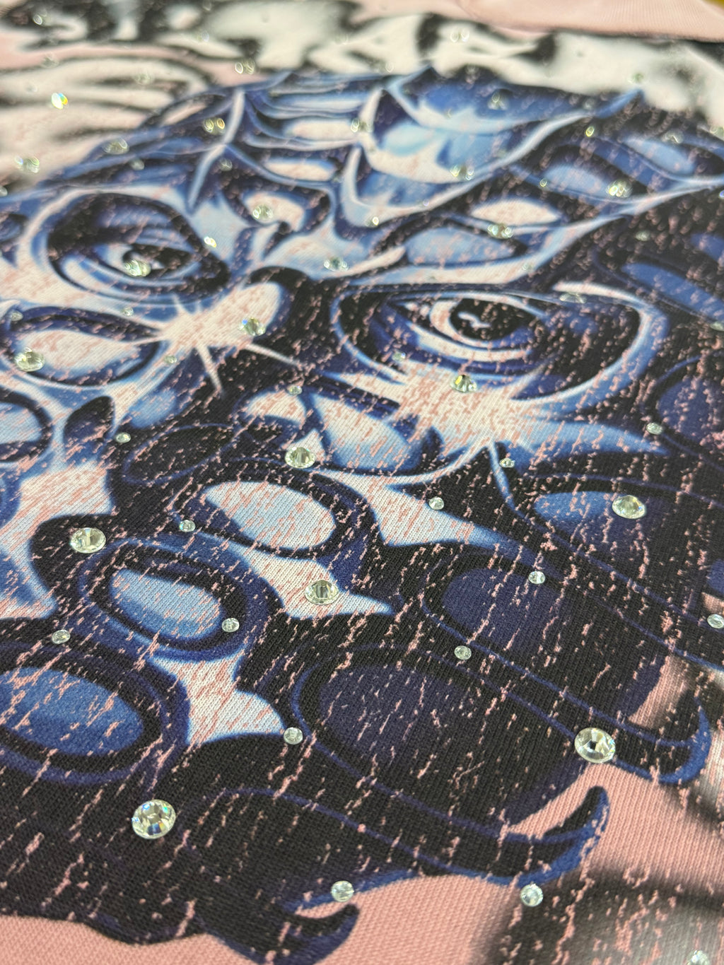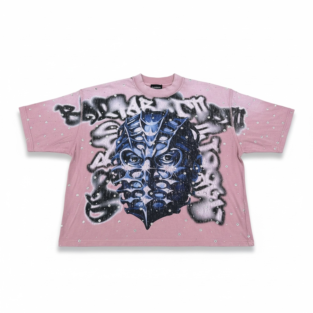 Bring dark art, luxury shine, and bold street style together with the Rare Peace 'Mask' Oversized Rhinestone Cropped T-shirt. Designed in a Dust Pink and highlighted with premium rhinestone graphics, this statement piece blends futuristic streetwear aesthetics with modern artwork