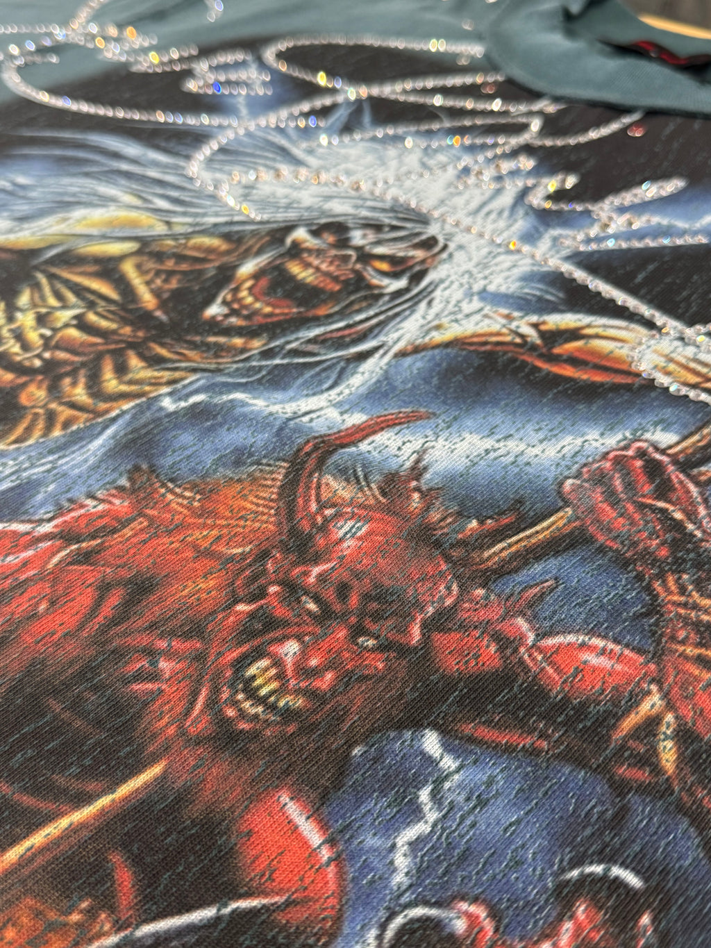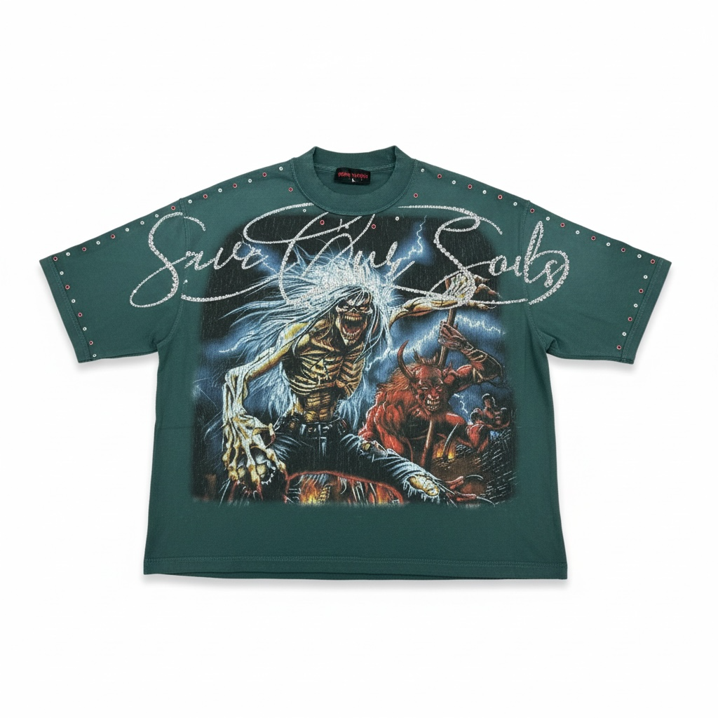 Bring dark art, luxury shine, and bold street style together with the Rare Peace 'Save Our Souls' Oversized Rhinestone Cropped T-shirt. Designed in a deep Green finish and highlighted with premium rhinestone graphics, this statement piece blends futuristic streetwear aesthetics with modern artwork