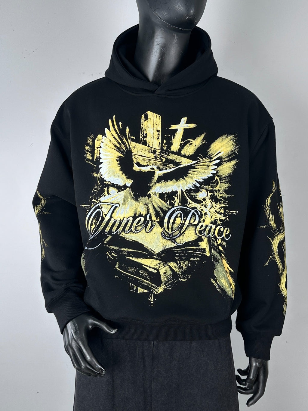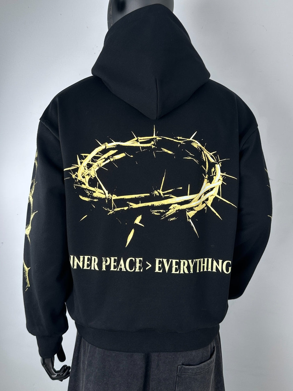 The classic black colorway delivers a clean, versatile look suitable for lounging, casual wear, or styled street-inspired fits. Ideal for shoppers searching for a pullover hoodie, casual black hoodie, or modern everyday sweatshirt, the Inner Peace ‘IP Over Everything’ Hoodie combines comfort, durability, and simple contemporary style.