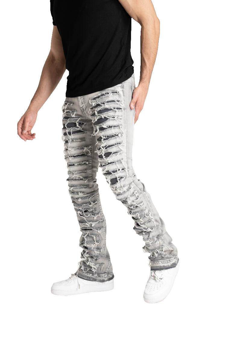 PREMIUM QUALITY SUPER STACK JEANS WITH MULTI RIP/REPAIR COTTON 98%, SPANDEX 2%, 38 INSEAM