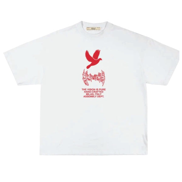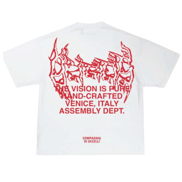 Short Sleeve cross-grain T-Shirt in Ivory White featuring the "Stacked" Logo on front, " Birds Heavy Metal" Logo on back. Crewneck collar. Standard fit.