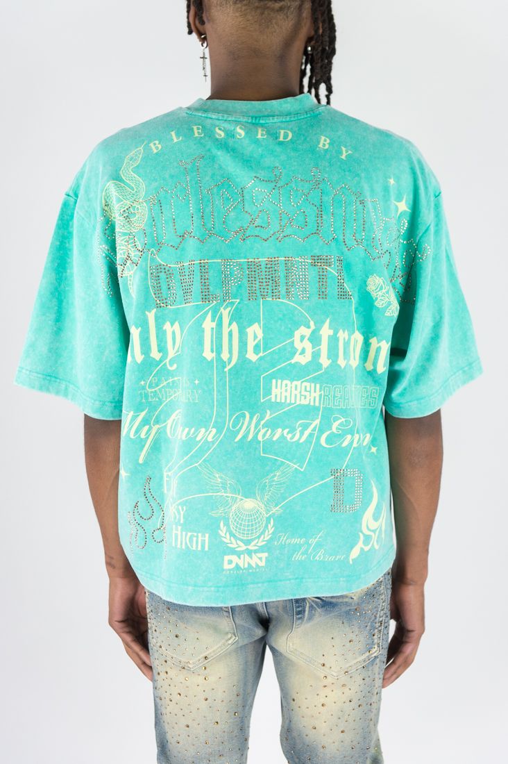 MINERAL WASH, DISCHARGE PRINT, DUO COLOR RHINESTONES