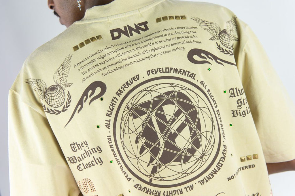 ACID WASH, HIGH-DENSITY PRINT, DISCHARGE PRINT, RHINESTONES, PYRAMID METAL STUDS
